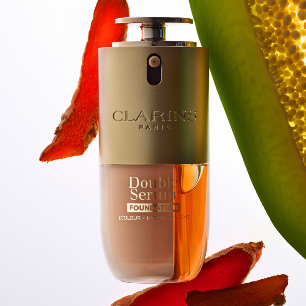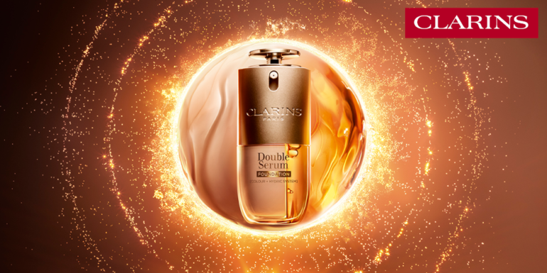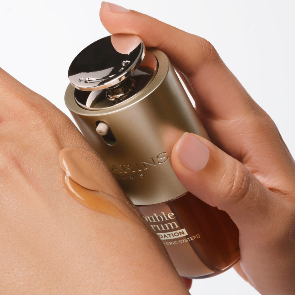 Mit der neuen Double Serum Foundation und der DOUBLE SERUM TECHNOLOGY [COLOUR + HYDRIC SYSTEM] präsentiert Clarins die nächste Generation einer hybriden Formel mit einer einzigartigen Make-up- und Skincare-Textur. Die 2 separaten Phasen werden direkt vor dem Auftragen miteinander vermischt. Sie verkörpern die perfekte Symbiose aus Make-up & Skincare. Die Anti-Age-Foundation unterstützt ein jugendliches Erscheinungsbild und schöne, klare Ausstrahlung der Haut.